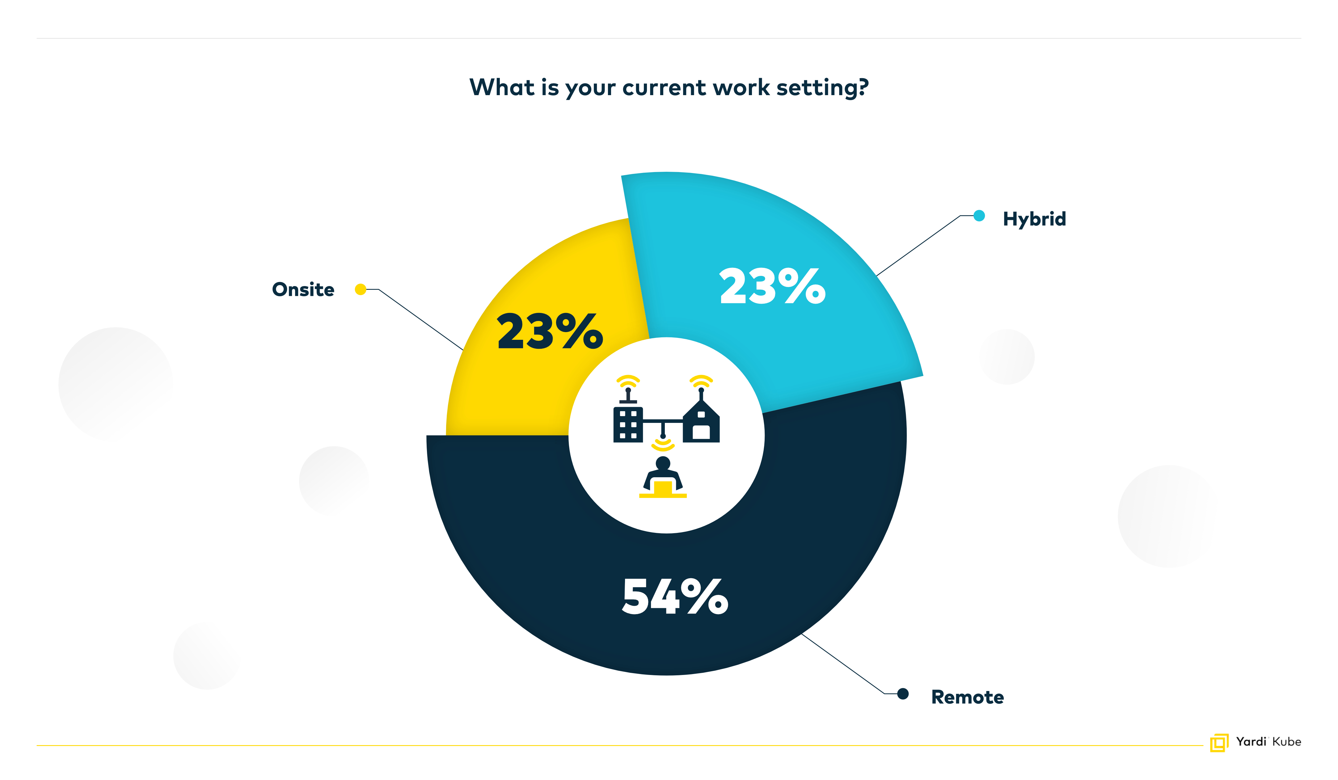 - 54% of respondents work remotely and 23% embrace hybrid work