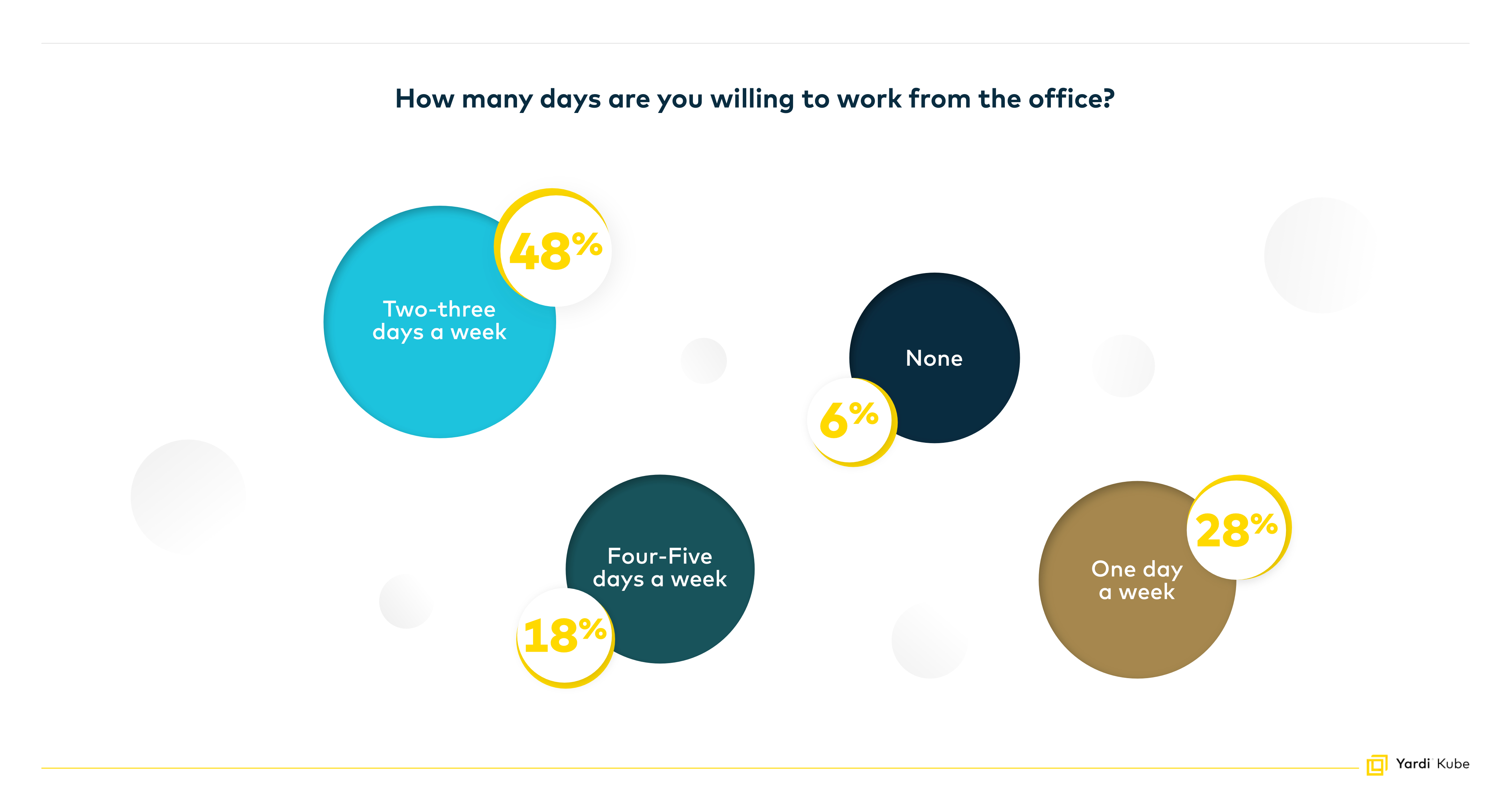 Among hybrid workers, the survey explored how many days they were willing to spend in the office. Nearly 48% favored a balanced schedule of two to three days per week, while 28% preferred just one day in the office. On the other end of the spectrum, 18% were comfortable with four to five days onsite, and 6% indicated they would prefer none at all. These figures reveal that hybrid workers are not monolithic: while many embrace the idea of blending remote and office work, their comfort levels vary widely. Employers setting policies around office attendance must therefore recognize that even within “hybrid,” preferences can diverge significantly.