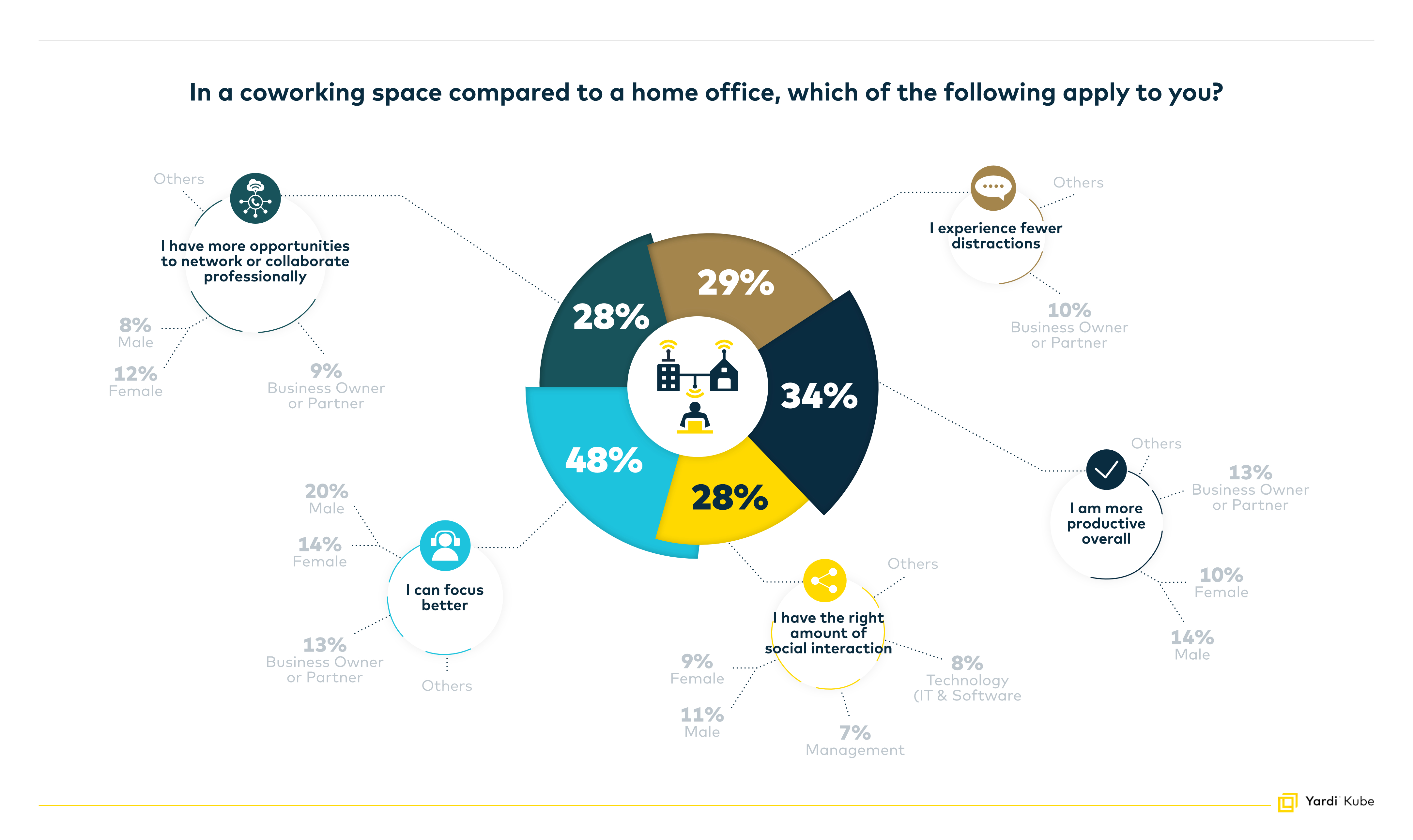 The survey shows that coworking spaces provide substantial advantages for many workers when compared to a home office. Nearly 48% of respondents’ choices indicated that they are able to focus better in a coworking environment, while 34% that they were more productive overall and 32% indicated improved time management. Among business owners and partners, 26% indicated they can focus better and be more productive in a coworking space. Along the same line, 10% of their responses also indicated they experience fewer distractions. Furthermore, a significant 34% of male respondents’ choices compared to 24% of female responds indicated that both focus and productivity are more easily achievable in a coworking space.