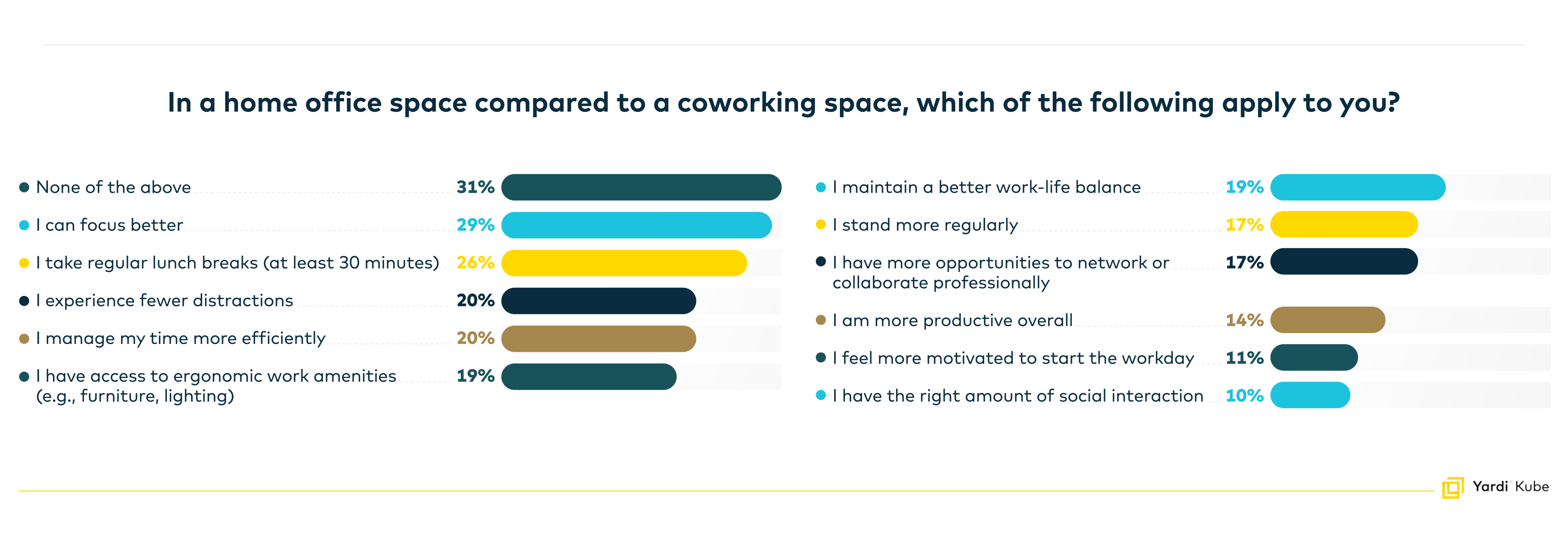Efficiency and comfort were also emphasized. 20% of respondents’ picks reported managing their time more effectively at home, while another 20% said they experienced fewer distractions compared to coworking spaces. Additionally, 19% highlighted access to ergonomic amenities, such as proper furniture or lighting, and 19% pointed to stronger work-life balance. These insights demonstrate that for some individuals, the comfort and control of a home office setup outweigh the structure provided by coworking spaces.