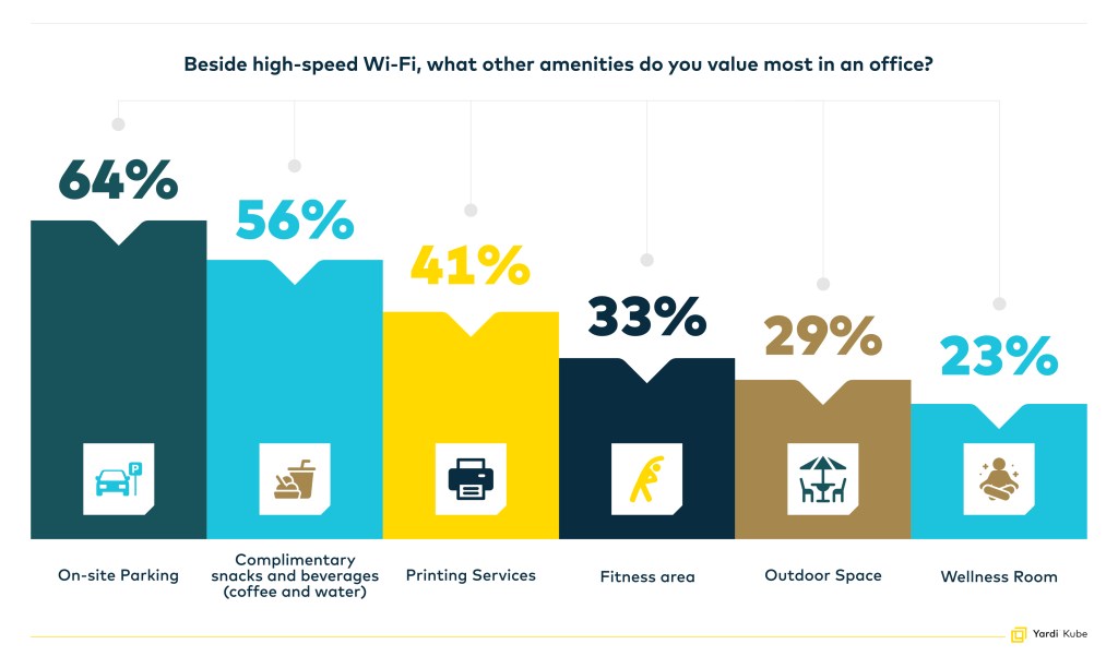 When asked about valued amenities, practical considerations dominated. 64% of respondent choices were on-site parking, making accessibility the most important factor by a wide margin. 56% highlighted complimentary snacks and beverages such as coffee and water, underscoring how small perks contribute to workplace satisfaction. Meanwhile, 41% of respondents’ choices still valued printing services, a reminder that traditional resources continue to play a role despite the increasing digitization of work.
